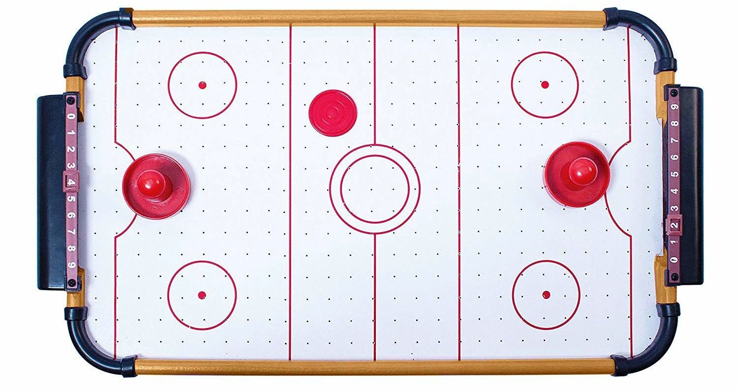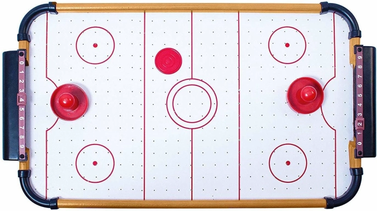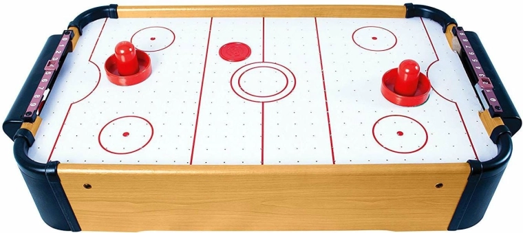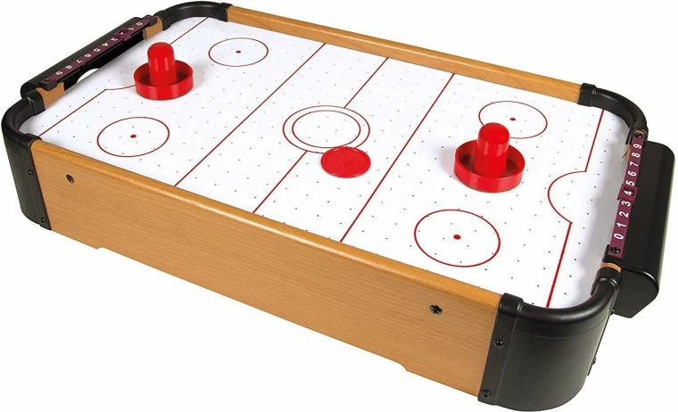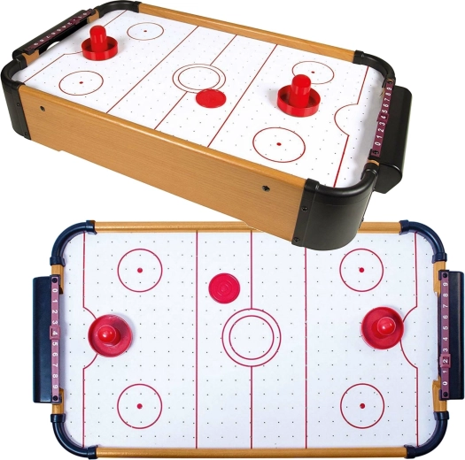 La table dispose d’un cadre en bois solide, de buts intégrés, d’un compteur de score manuel coulissant de chaque côté et est livrée avec deux poussoirs et un palet. Le jeu développe la concentration, la coordination œil-main et l’esprit de fair-play.