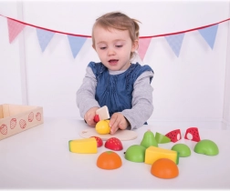 Une planche réaliste et un couteau en bois encouragent le jeu de cuisine sans risque. Les morceaux de fruit tiennent ensemble et se séparent facilement lors de la découpe.
