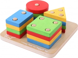 Base en bois avec chevilles ; formes géométriques colorées (cercle, carré, triangle, rectangle)
