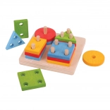 Des cercles, carrés, triangles et rectangles multicolores aident à distinguer les couleurs et les formes. Les chevilles et les pièces facilitent l’initiation au comptage.