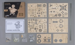 Le kit comprend tout le nécessaire : pièces prédécoupées en contreplaqué, axes en acier, diode, bande de film et manual illustré avec QR code vers la vidéo de montage. Le modèle est un excellent cadeau et en même temps une décoration design pour le bureau ou le salon.