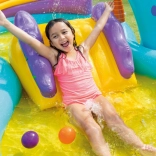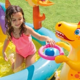 Le joyeux parc aquatique Intex Dinoland transforme le jardin en un lieu plein de divertissements estivaux. Les enfants glissent sur le toboggan gonflable jusque dans la pataugeoire, se rafraîchissent sous la fontaine d’eau et jouent avec le dinosaure gonflable équipé d’un panier de lancer. Le tapis d’atterrissage souple augmente le confort et la sécurité pendant les jeux.
