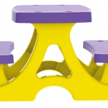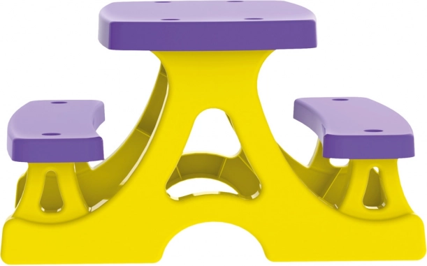 L’ensemble, dans une combinaison jaune‑violet vive, illumine tout espace et offre une surface stable pour les collations, les activités créatives et les moments partagés.