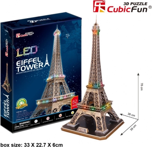 Construisez chez vous l’emblématique tour Eiffel sous forme de puzzle 3D de la collection CUBICFUN avec éclairage LED. Les pièces en mousse de qualité revêtues de papier se montent facilement sans colle ni ciseaux, et le modèle final se distingue comme une décoration élégante avec une hauteur impressionnante de 78 cm.