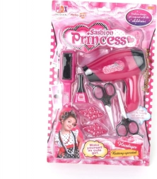 - Petit sèche-cheveux, fer à boucler, peigne/brosse, barrettes et accessoires décoratifs (selon illustration)