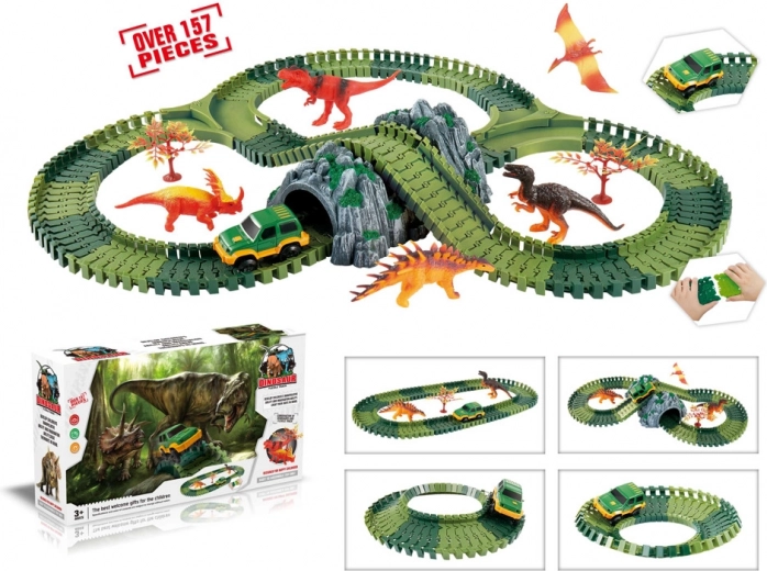 Piste modulable avec dinosaures et tunnel, 144 pièces