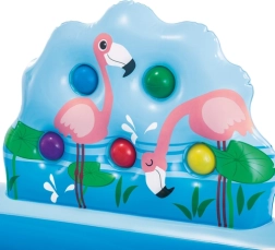 - piscine, glissade, fontaine, flamant, petit singe, petit hippopotame, anneau (ringo), 5 balles, rustine de réparation, notice, emballage coloré