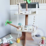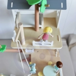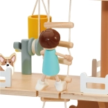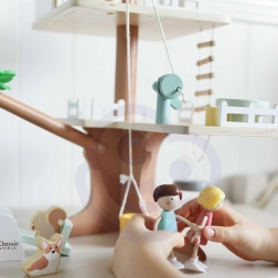 Le coffret contient 31 éléments dont 2 figurines d’enfants, 2 animaux et des accessoires tels que balançoire, balançoire-pneu, balançoire d’équilibre, lit, table, chaises et coffre au trésor. Le bois naturel soigneusement travaillé aux couleurs douces est durable et agréable au toucher.