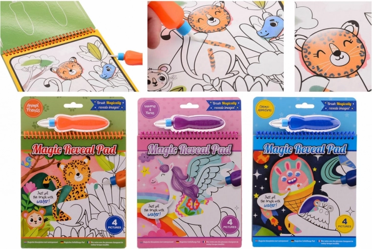 Peinture à l’eau – espace, petits animaux et licorne. L’emballage contient un pinceau à eau. Remplis le pinceau d’eau et tu peux peindre.