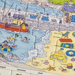 Découvrez tout ce que l’on peut trouver sur la plage et apprenez à nommer les sports nautiques grâce à ce puzzle amusant. Chaque pièce représente un mot différent qui doit être associé à la bonne image sur le bord du puzzle. Le puzzle contient 18 pièces au centre qui forment une scène complète avec des mots de vocabulaire en anglais. Les enfants peuvent retrouver les mots sur l’illustration pour une meilleure compréhension.