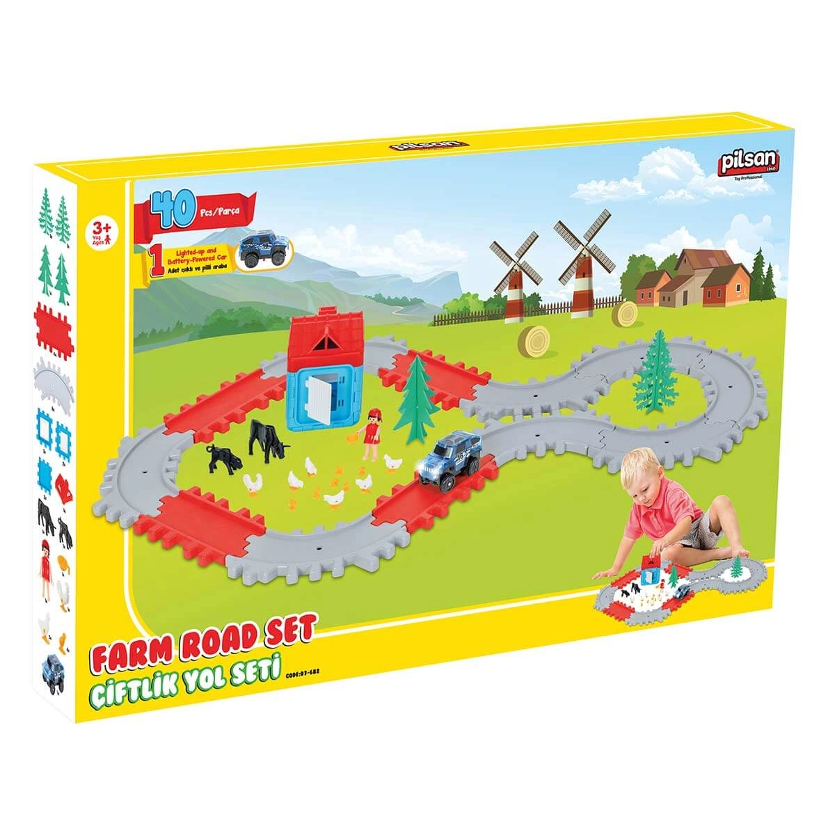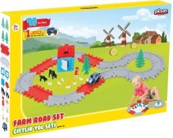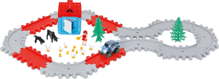 Circuit routier avec des animaux et une petite maison. Une petite voiture à piles est incluse dans l’emballage. Les dimensions du circuit assemblé sont de 98 cm de long et 61 cm de large.
