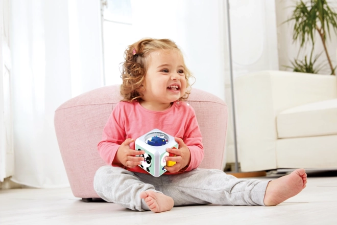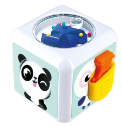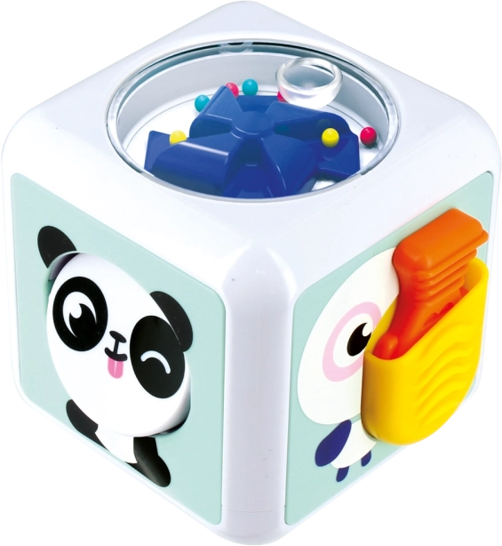 Ce cube sensorimoteur est conçu pour stimuler la perception sensorielle des enfants. Il contient différentes textures, boutons, miroirs et pièces mobiles qui stimulent le toucher et la vue de l'enfant.