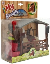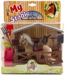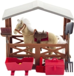 - Cheval avec selle et licol, écurie, seau, balai, fourche, pelle, mallette avec fournitures