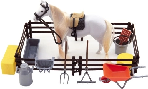 L’enclos et les accessoires élargissent les possibilités de jeu – de l’alimentation au repos du cheval dans un espace sécurisé.