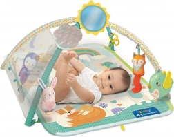 Il comprend des jouets suspendus amovibles, un miroir pour la découverte de soi, un hochet-nuage imitant le bruit de la pluie, trois anneaux de dentition et un module électronique avec mélodies et sons de la nature. Le tapis est lavable à 30 °C, les pièces en plastique se nettoient d’un simple coup de chiffon humide. Un espace de jeu sécurisé qui favorise la coordination des mouvements, la perception spatiale et l’imagination.