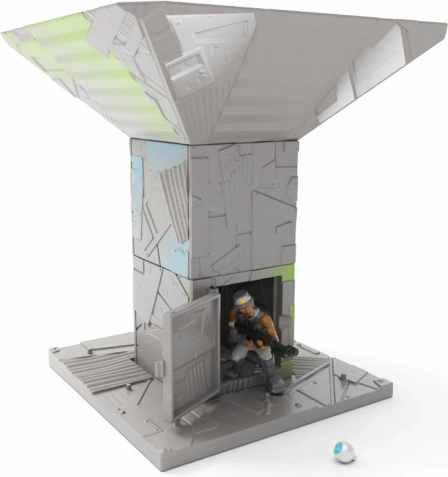 Une structure grise futuriste aux panneaux géométriques, facile à assembler, offrant un environnement interactif pour les figurines.