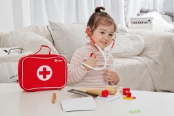 Le set de Classic World contient tout ce qu'un petit médecin a besoin pour jouer au médecin. Les enfants peuvent écouter le battement de cœur de leurs patients (oursons en peluche, poupées) avec le stéthoscope, 'mesurer' la température avec le thermomètre, 'injecter' ou administrer les médicaments nécessaires. Jouer au médecin n'est pas seulement un jeu de rôle aimé, mais aussi une leçon d'empathie et de coopération, ce qui est très important pour les relations sociales. Ce set encourage le développement de l'imagination et l'apprentissage de la résolution de problèmes.