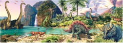 Ce puzzle de 150 pièces compose une scène fascinante pleine de dinosaures dans un environnement tropical, où les enfants découvrent le monde ancien.