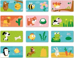 Découvrez un premier puzzle pour les tout-petits – le set DODO « Que mangent les animaux ? » propose 12 puzzles simples en deux pièces qui développent la logique, la motricité fine et la découverte du monde. De grandes pièces solides d’environ 3 mm d’épaisseur sont faciles à saisir et à assembler, idéales pour les enfants qui débutent avec les puzzles.