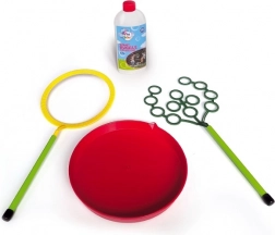 La boîte contient deux anneaux – l’un pour les bulles géantes et l’autre pour plein de petites bulles, ainsi qu’un bol rouge pour un trempage pratique et une recharge de 0,5 l. Idéal pour les après‑midis en famille, les fêtes et les jeux en extérieur.