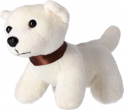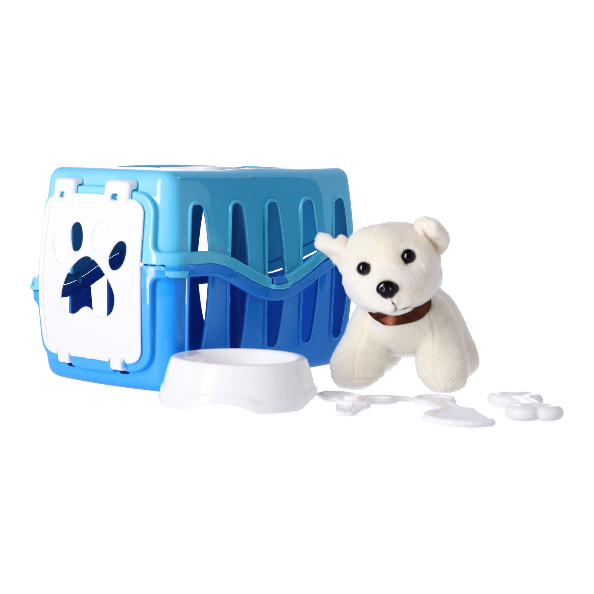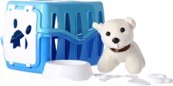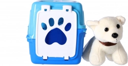 Chiot dans une caisse de transport bleue. Le set de jeu comprend un chiot en peluche, une caisse, une gamelle, des ciseaux et un petit os. Conforme aux normes les plus strictes de l’UE. Fabriqué avec des matériaux non toxiques.