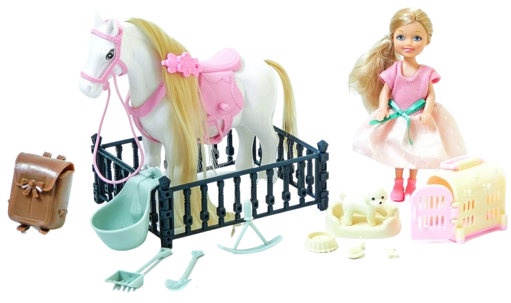 - Petit cheval, poupée, chien, enclos, panier et autres accessoires