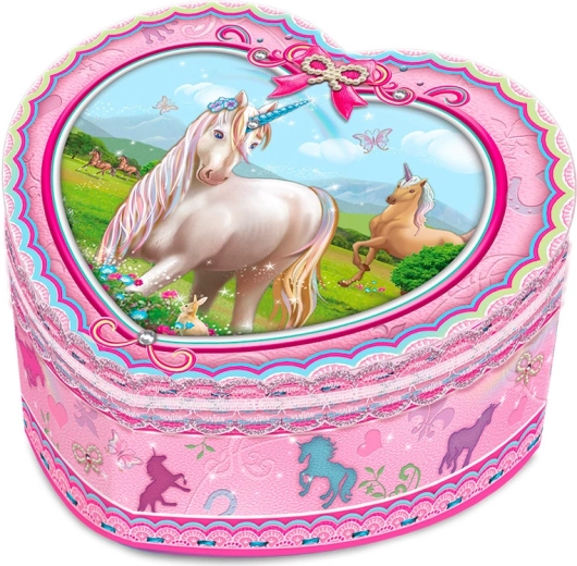 Charmante boîte à bijoux en forme de cœur avec motif de licorne qui apporte aux enfants la joie de ranger leurs trésors. À l’ouverture, elle joue une douce mélodie, offre assez d’espace pour les bijoux et petites trouvailles et, grâce à sa construction solide, elle est idéale pour un usage quotidien.