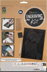 Créez une œuvre originale sur le thème du chat – il suffit de gratter délicatement les lignes préimprimées pour faire apparaître sous la couche noire des couleurs arc‑en‑ciel. Laissez libre cours à votre imagination : vous pouvez aussi travailler les zones noires libres et créer votre propre cadre ou des détails.