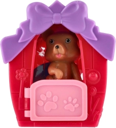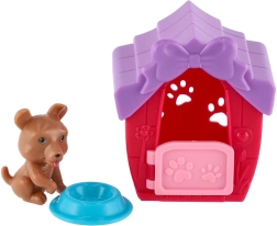 Le set comprend une gamelle et une figurine de chiot. La maisonnette est ornée d’un petit nœud et de pattes en relief qui apportent une touche de charme au jeu.