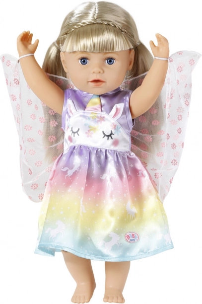 Les fées et les licornes vont ensemble comme le lait et les biscuits. La petite robe de fée pour la poupée BABY born est confectionnée dans un magnifique tissu arc‑en‑ciel. La jupe est imprimée de licornes magiques dansant dans le ciel étoilé. Le haut de la robe est décoré à l’avant d’un visage de licorne avec de petites oreilles appliquées et une corne colorée. Une vraie fée doit bien sûr avoir des ailes. Des ailes transparentes ornées de petites fleurs scintillantes sont cousues au dos de la robe et, dès que BABY born passe le bras dans la petite ouverture en haut des ailes, elles s’ouvrent. Tenue originale pour les poupées BABY born. Pour un jeu imaginatif, varié et durable. BABY born Costume féerique Licorne pour poupées de 43 cm. Cintre inclus.