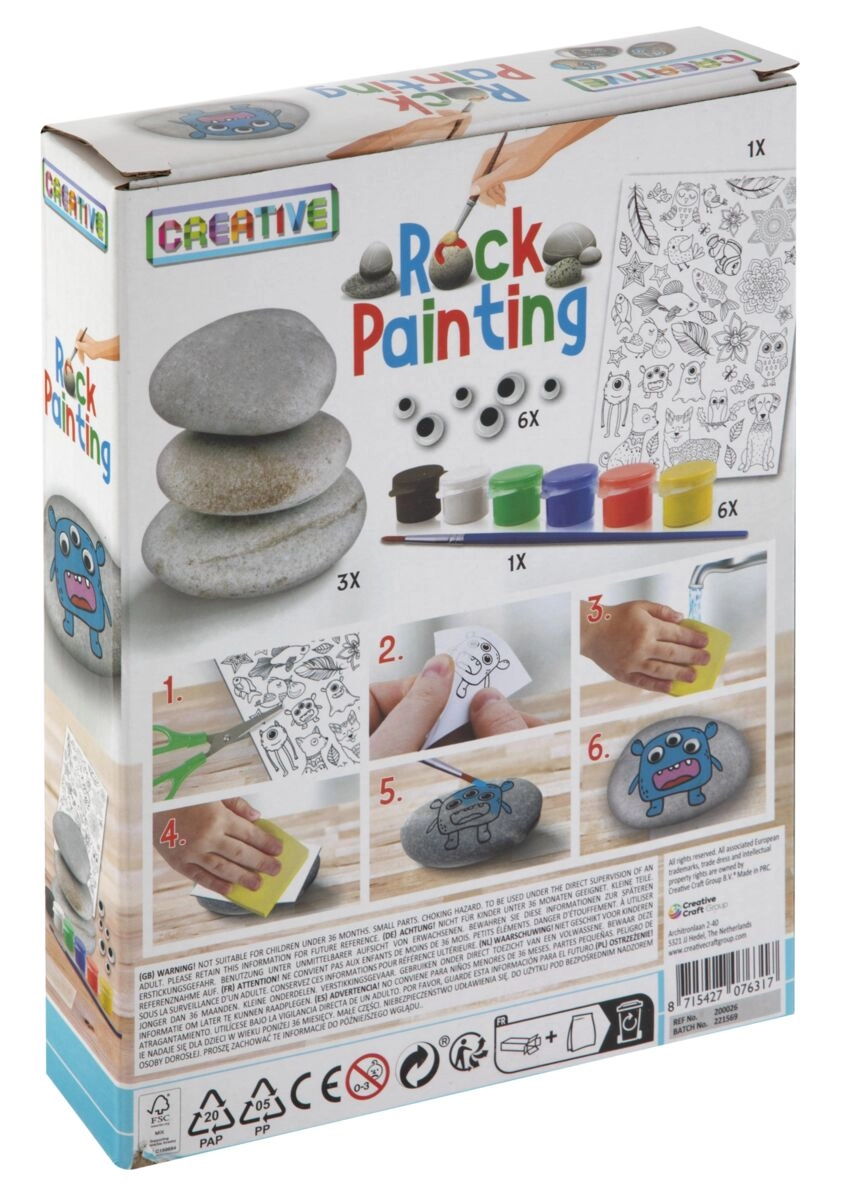 3 galets lisses, 6 peintures acryliques, pinceau, planche d’autocollants, 6 yeux mobiles