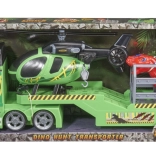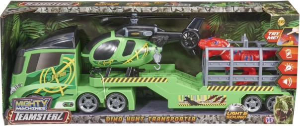 Le set inclut un transporteur, un hélicoptère et un dinosaure, tous avec des effets lumineux et sonores réalistes.