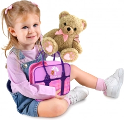Adorable ourson en peluche avec sac à main tendance CUTEKINS, le compagnon idéal en voyage comme dans la chambre. Grâce au sac pratique, l’enfant peut transporter facilement l’ourson, jouer et ranger de petits objets. Idéal comme cadeau pour les petits amoureux des peluches dès 2 ans. Peluche douce, transport confortable et design stylé dans des tons rose‑violet.
