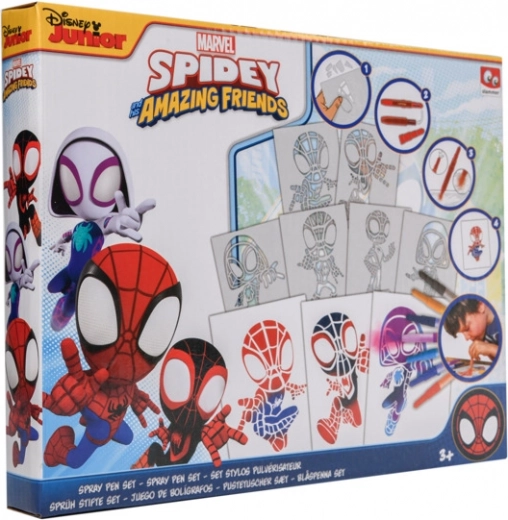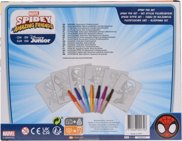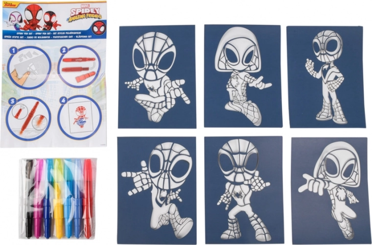 Coloriage avec des feutres à souffler Spidy – contient 7 feutres à souffler et 6 pochoirs avec images.
