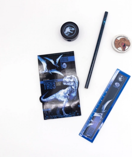 Un ensemble scolaire stylé à motif Jurassic World qui apporte tout le nécessaire pour écrire et prendre des notes : crayon, gomme moulée, boîte pour taille-crayon, règle et bloc-notes moulé.