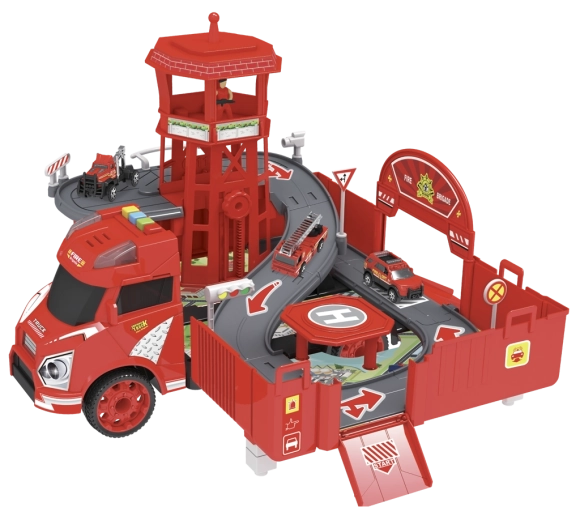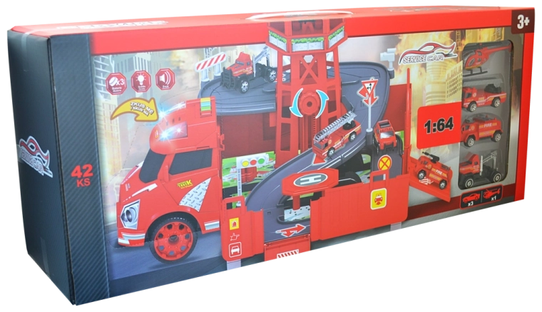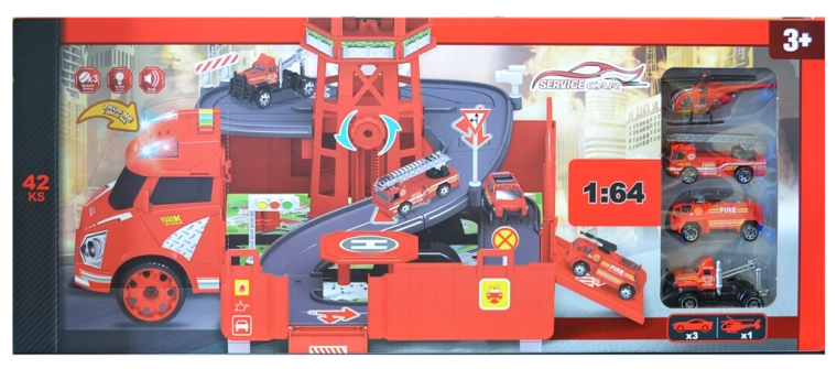 Gare de pompiers avec garage et accessoires (coffret). Dimensions du garage déployé : 46,5 × 49 × 29 cm, boutons pour effets sonores et lumineux, roue libre, fonction « ESSAIE-MOI ». Activation de la fonction ESSAIE-MOI : retirez la languette de sécurité du compartiment à piles, située sur la cabine du véhicule, puis testez les fonctions en appuyant sur les boutons placés sur le toit de la cabine. Contenu du coffret : camion de pompiers/garage 2-en-1 (transformation du véhicule en garage et inversement), modèle réduit métallique à l’échelle 1:64 (6 pièces) et hélicoptère.