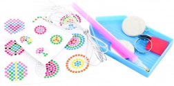 Le kit comprend 8 couleurs de strass, une base pour pendentif et une base de bague, un cordon, 9 modèles pour pendentifs, 4 modèles pour bagues, un plateau et un stylo applicateur – il suffit d’ouvrir et de créer.