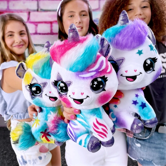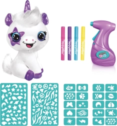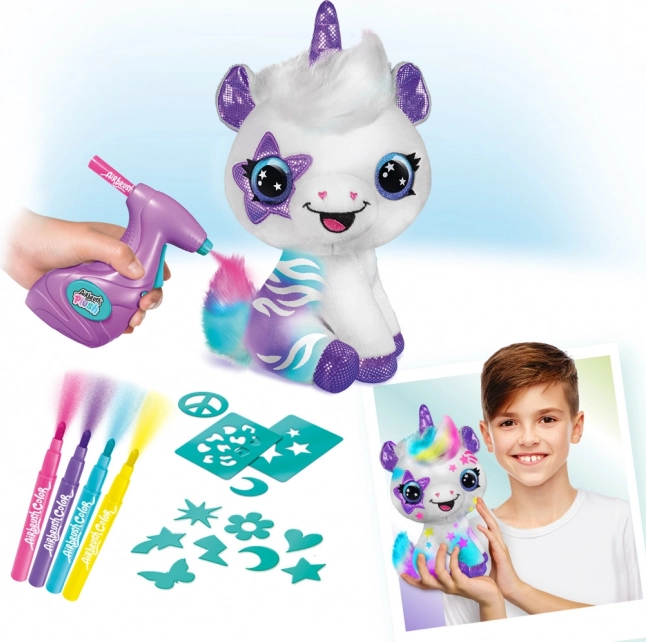Pulvérisation de couleurs facile sur la licorne en peluche avec des pochoirs ou à main levée. Parfait pour les débutants comme pour les petits artistes.