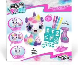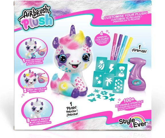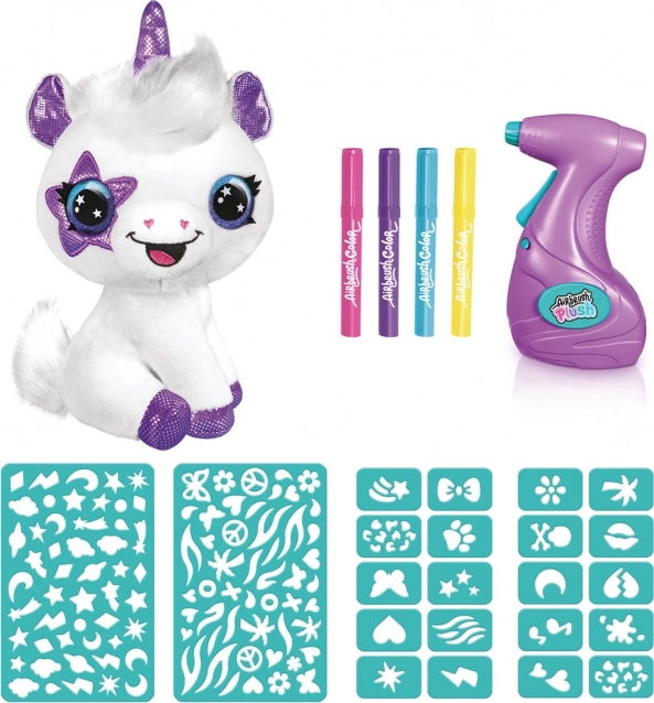 - Licorne en peluche, aérographe, 3 cartouches de couleur, 120 pochoirs autocollants, gants de protection en plastique, notice