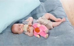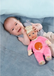 Adorable poupée en tissu BABY born pour bébés qui transforme l’endormissement en conte de fées. En appuyant sur le petit cœur sur le ventre, la veilleuse s’allume et une mélodie apaisante se fait entendre. Elle a un corps tout doux, des textures agréables à découvrir et convient dès la naissance.