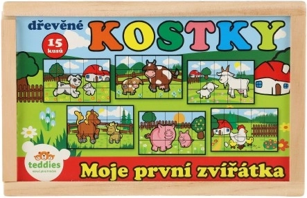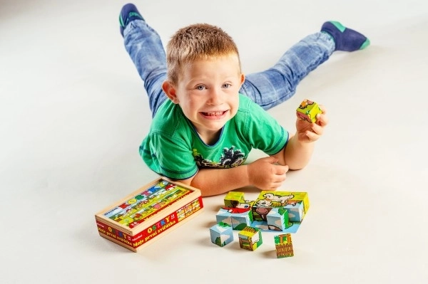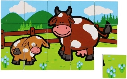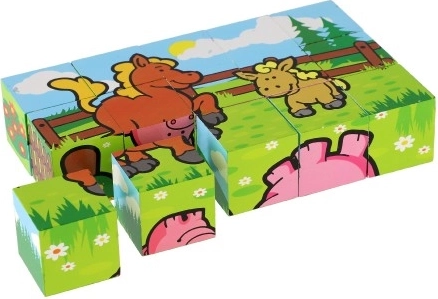 Les blocs en bois avec des images colorées de divers animaux domestiques sont un excellent outil pour le développement des enfants. Lorsque correctement assemblé, l'un des six dessins apparaît, encourageant la réflexion logique et l'imagination chez les plus petits. Pendant la construction et la destruction de tours, les enfants comprennent le principe de l'équilibre et les bases de la cause et de l'effet.