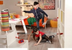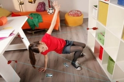 Les unités rouges et les pinces créent un réseau de « lasers » bleus. Les enfants développent leur agilité et leur coordination tout en s’amusant dans un environnement domestique sécurisé.