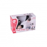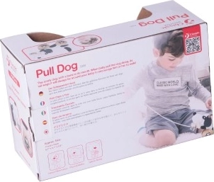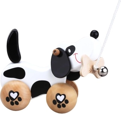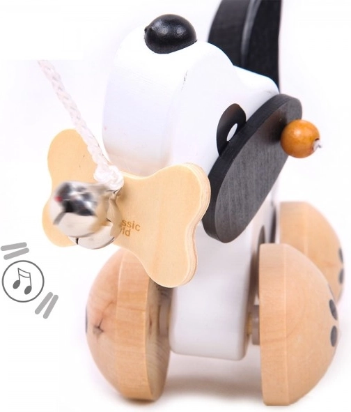 Le chien est sur des roues avec un motif de pattes et sa queue se remue en mouvement, ce qui ajoute à son côté ludique. Le plaisir est renforcé par une clochette qui stimule la perception auditive des enfants. Il est équipé d'une ficelle reliée à un os dans sa bouche, ce qui permet une traction facile. Le jouet est adapté pour jouer, tant à l'intérieur qu'à l'extérieur.