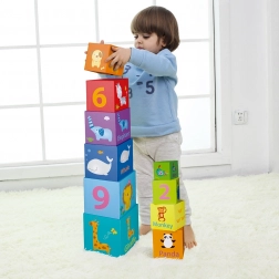 Ces blocs colorés contiennent des chiffres, des animaux et des mots anglais, aidant ainsi à l'apprentissage et au développement des capacités cognitives.