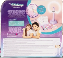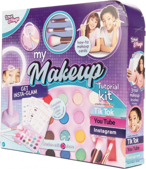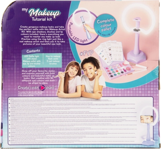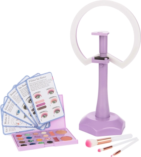 - 3 pinceaux, palette de fards à paupières, rouges à lèvres, blushs, lumière LED, cartes de tutoriels