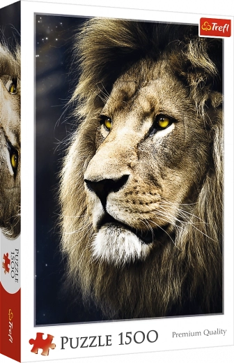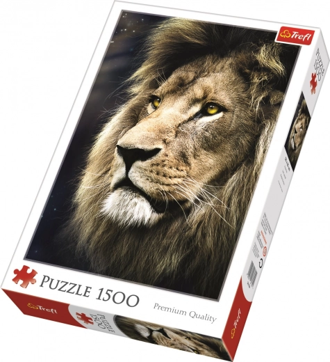 Puzzle 1500 pièces avec portrait de lion. Format 85 × 58 cm, papier calandré anti-reflets, couleurs intenses et impression écologique sûre.