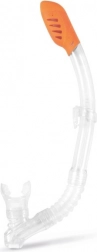 Le capuchon supérieur anti-éclaboussures (splash guard) limite la pénétration de l'eau dans le tube, tandis que la pointe orange vif améliore la visibilité en surface. La pince/clip pour masque maintient la tuba dans la bonne position. Idéale pour la nage et le snorkeling récréatifs des enfants dès 8 ans.