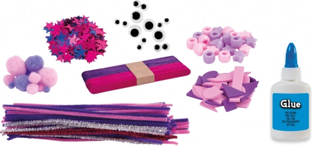 Fils chenille, pompons, formes en mousse, perles, yeux autocollants et colle classique ou pailletée — la combinaison idéale pour d’innombrables projets créatifs.