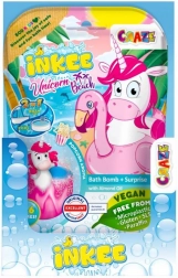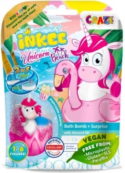 Offrez aux enfants un bain ludique avec la bombe INKEE, qui pétille, colore l'eau et cache une surprise licorne de plage. Profitez du parfum de popcorn sucré, d'une formule sûre sans microplastiques, SLS ni paraffine et de deux variantes de couleur – rose ou violet. Emballé dans un sachet écologique.
