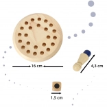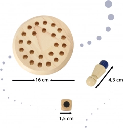 • Contenu de la boîte : plateau circulaire perforé, 24 chevilles en bois de 6 couleurs, dé en bois avec couleurs